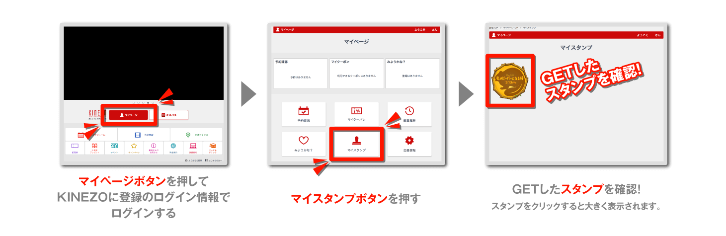 - ※本スタンプは、オンライン予約《KINEZO》もしくは《キネパス》を利用してのチケット予約・購入により発行されるものです。