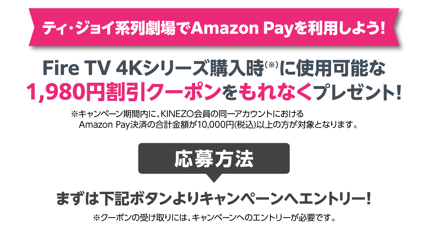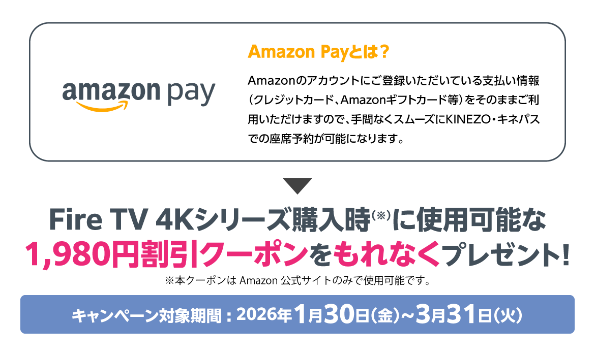 ※Amazon、Amazon Pay、Fire TV及びこれらに関連するすべての商標は、Amazon.com, Inc. 又はその関連会社の商標です。※本キャンペーンは株式会社ティ・ジョイの主催です。本キャンペーンについてのお問い合わせはAmazonではお受けしておりません。