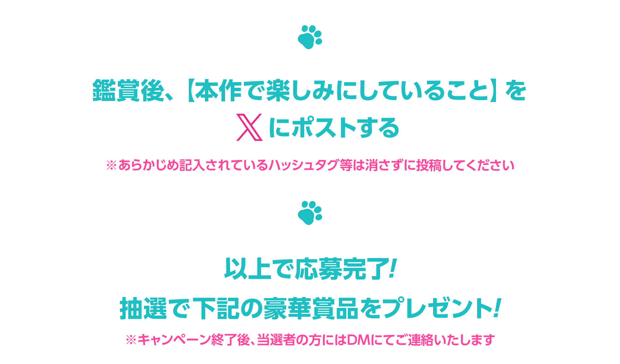 - ※ダイレクトメッセージを受信拒否設定している場合、当選連絡をすることができないため、応募対象外となります。