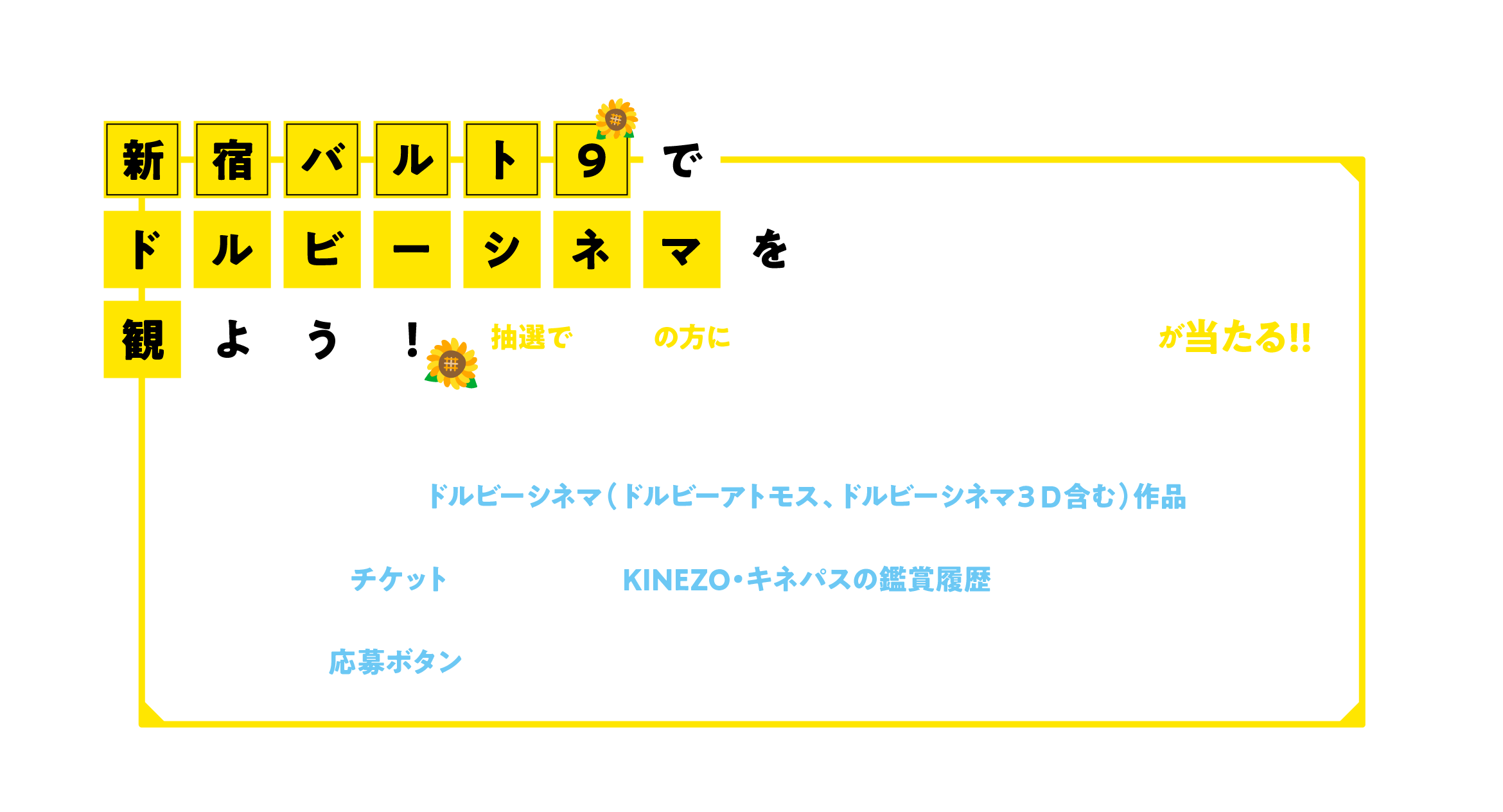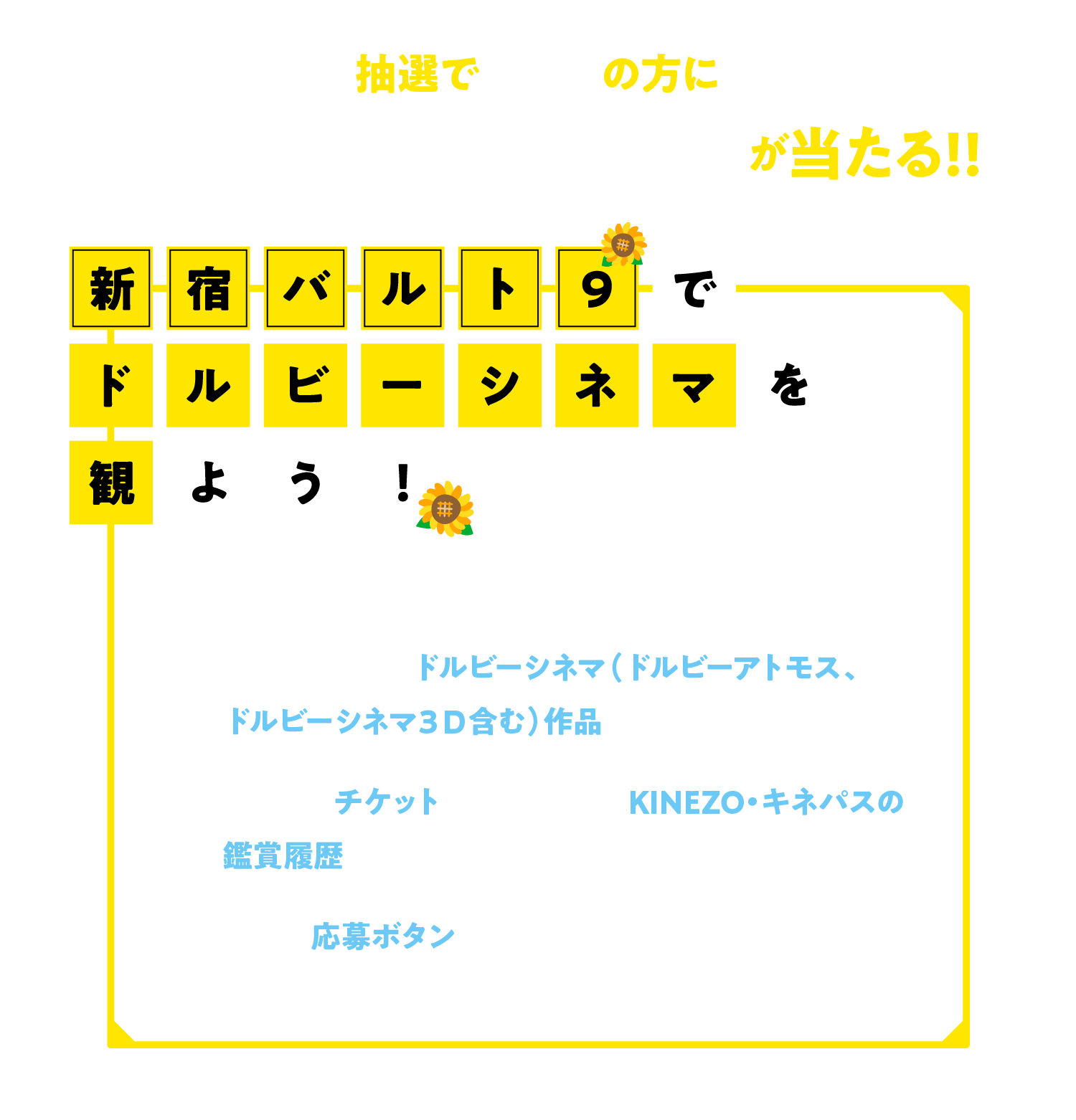 ※ キャンペーン応募対象のチケット・鑑賞履歴は、応募期間内に新宿バルト9で鑑賞したドルビーシネマ(ドルビーアトモス、ドルビーシネマ3D含む)作品のチケット、または鑑賞履歴です。