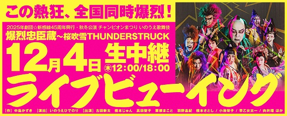 劇団☆新感線45周年を祝うお祭り公演『爆烈忠臣蔵 ~桜吹雪THUNDERSTRUCK~』が、12月4日(木)にライブビューイングされます。