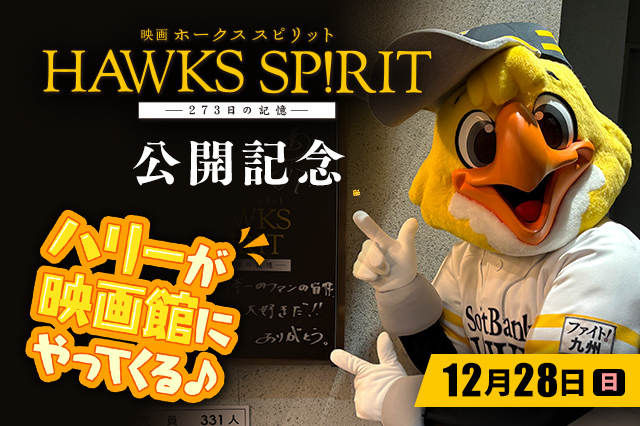 12月26日(金)に公開する長編ドキュメンタリー「映画 HAWKS SP!RIT -273日の記憶-」の公開を記念して、12月28日(日)限定でハリーホークとハニーズが映画館にやってきます!映画の上映終了後、ハリーホークとの写真撮影やプレゼントじゃんけん大会をお楽しみください!