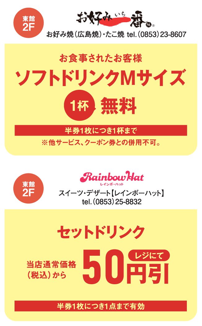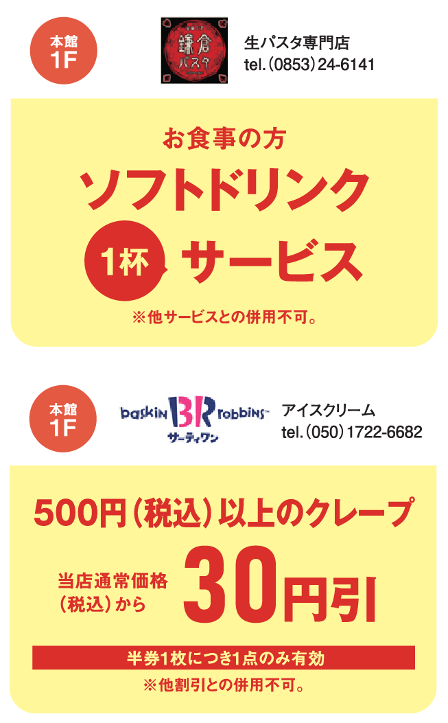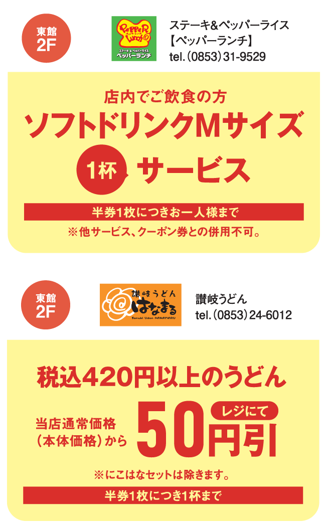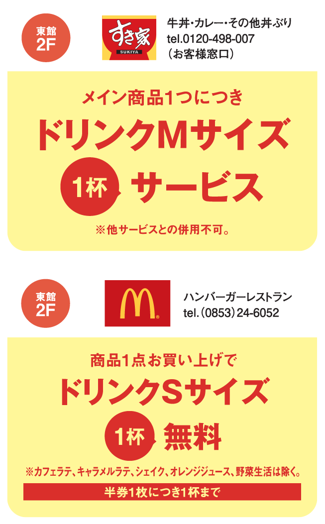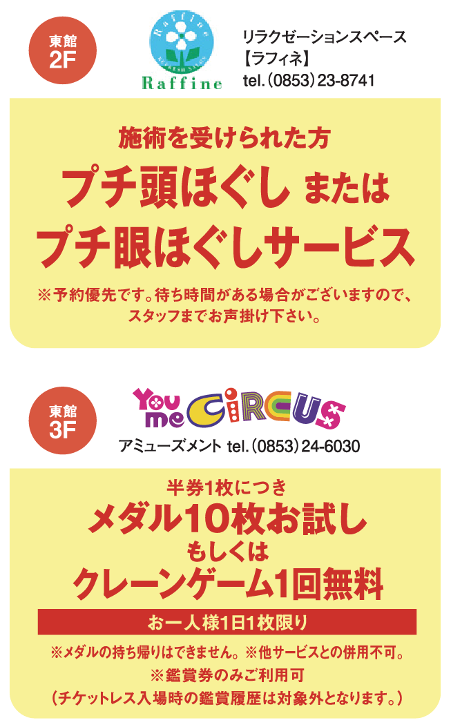 ■ チケット1枚で複数の専門店のサービスが受けられます。 ■ 鑑賞前日または当日のどちらでもご利用いただけます。 ■ 精算後のご提示は無効となりますので、必ずご注文前またはご精算前にご提示ください。 ■ その他のサービス、割引企画との併用はできません。■ 予告なく、特典やサービスの内容が変更になる場合もございますので、予めご了承願います。 ■ ゆめタウン出雲 専門店のみの企画とさせていただきます。 ■ お酒の販売・提供は20歳以上の方に限らせていただきます。