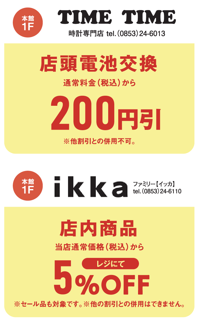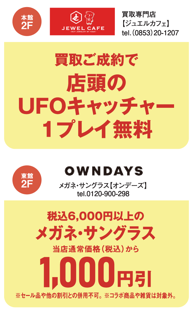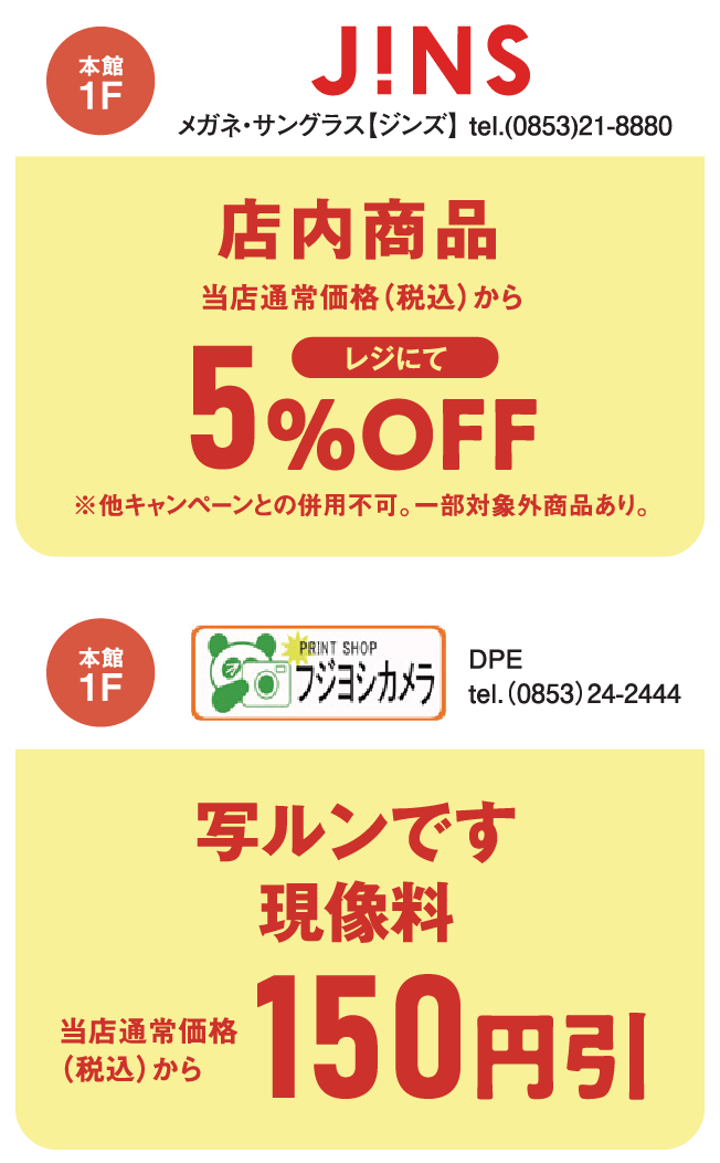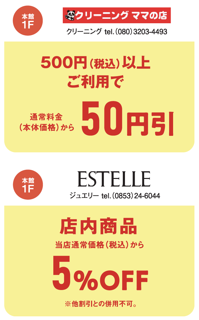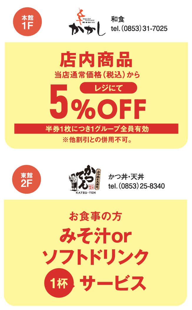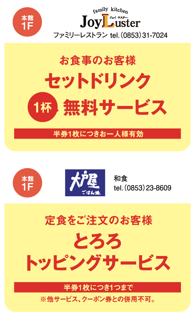 ■ チケット1枚で複数の専門店のサービスが受けられます。 ■ 鑑賞前日または当日のどちらでもご利用いただけます。 ■ 精算後のご提示は無効となりますので、必ずご注文前またはご精算前にご提示ください。 ■ その他のサービス、割引企画との併用はできません。■ 予告なく、特典やサービスの内容が変更になる場合もございますので、予めご了承願います。 ■ ゆめタウン出雲 専門店のみの企画とさせていただきます。 ■ お酒の販売・提供は20歳以上の方に限らせていただきます。