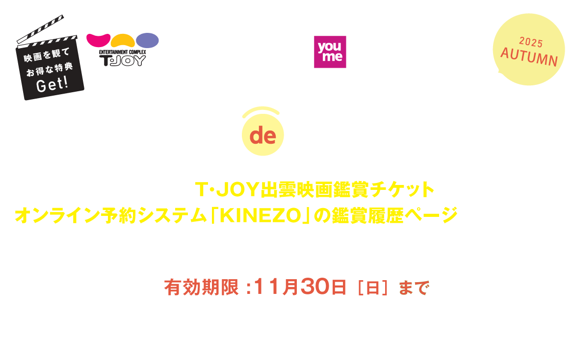 ※ キャンペーン応募対象のチケット・鑑賞履歴は、応募期間内にT・ジョイ出雲で鑑賞した作品のチケット、または鑑賞履歴です。