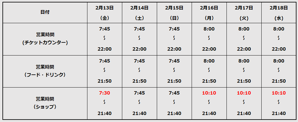 ※新作公開日や混雑が予想される場合は時間が変更になる場合がございます。その際はお知らせ欄から個別記事をご覧ください。